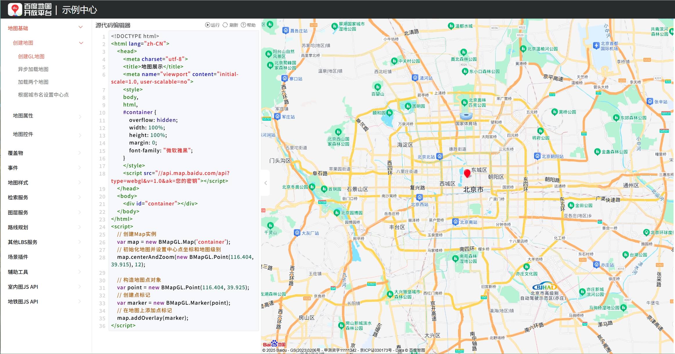 根据百度地图API官方文档,基础地图的创建、加载与显示主要通过JS代码完成。创建地图必须的代码如下: