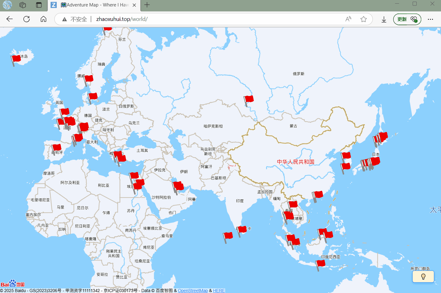 我们的核心需求是给定一些曾经去过的地方,网页需要在地图上展示对应的标记,类似于在一幅现实地图上“插旗”,如下所示。